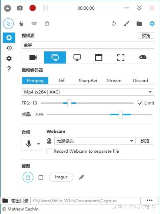 Captura在视频设置中,选择录制区域,视频编码器,帧率及质量。在视频上方,可以看到鼠标、手指等图标,它们的激活状态可以决定视频是否会显示鼠标、鼠标点击痕迹、按下的键盘按键等信息。